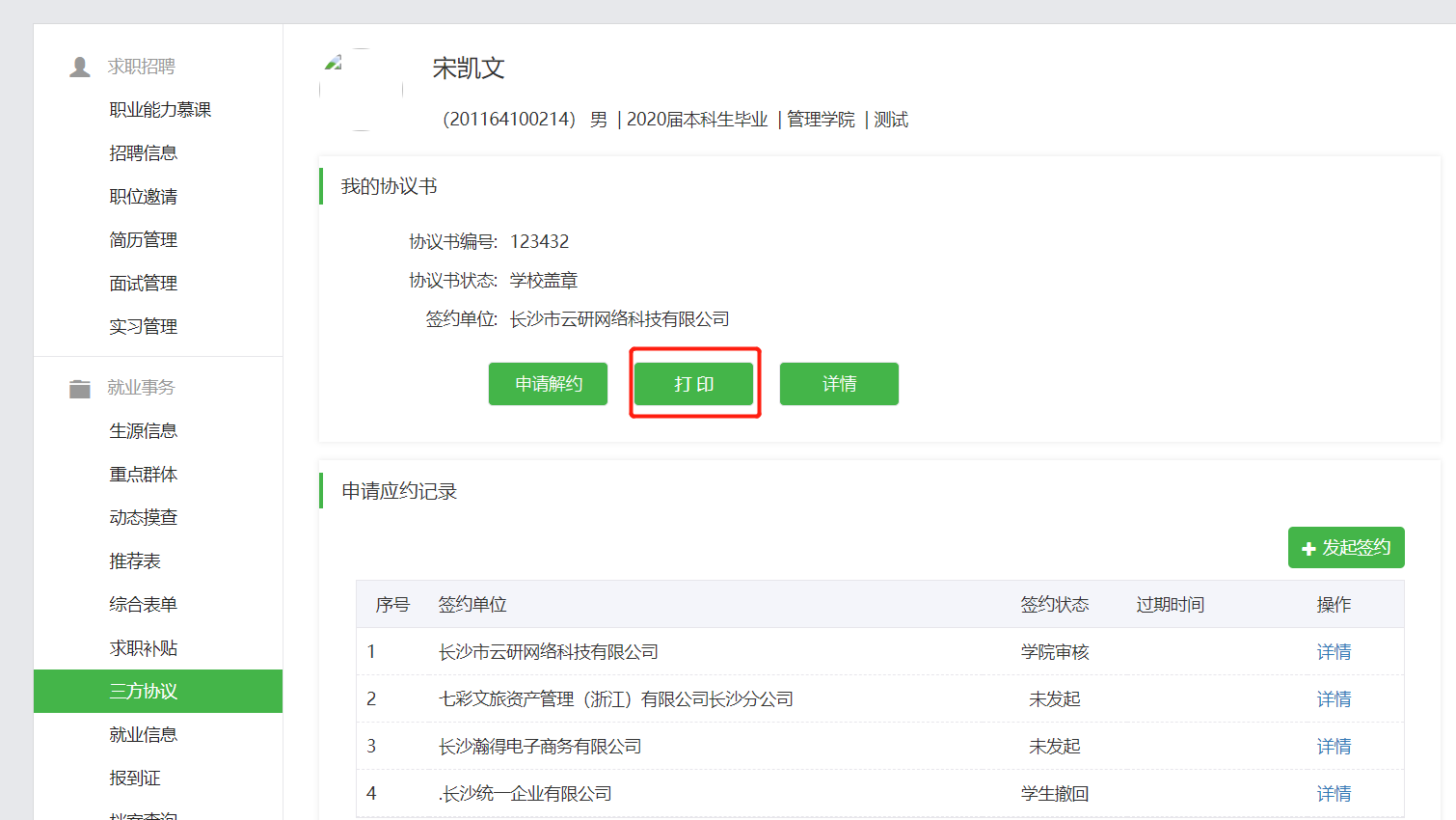 第六步:等待学生应约,以及学校审核通过后(都会有微信通知及后台通知),即可登录后台,打印三方协议,盖章邮寄给毕业生。