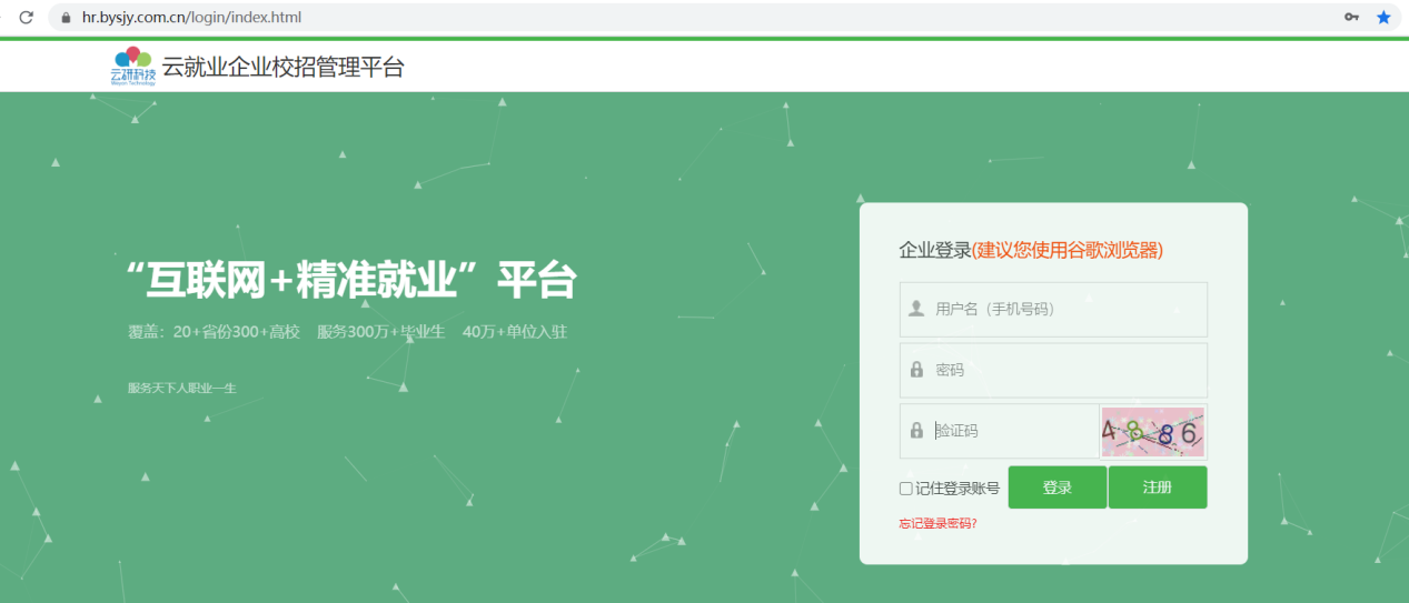 第一步:登陆云校招企业服务平台(https://hr.bysjy.com.cn/login/index.html)没注册账号的,点击页面上注册按钮先行注册,等审核通过后再进行网签。