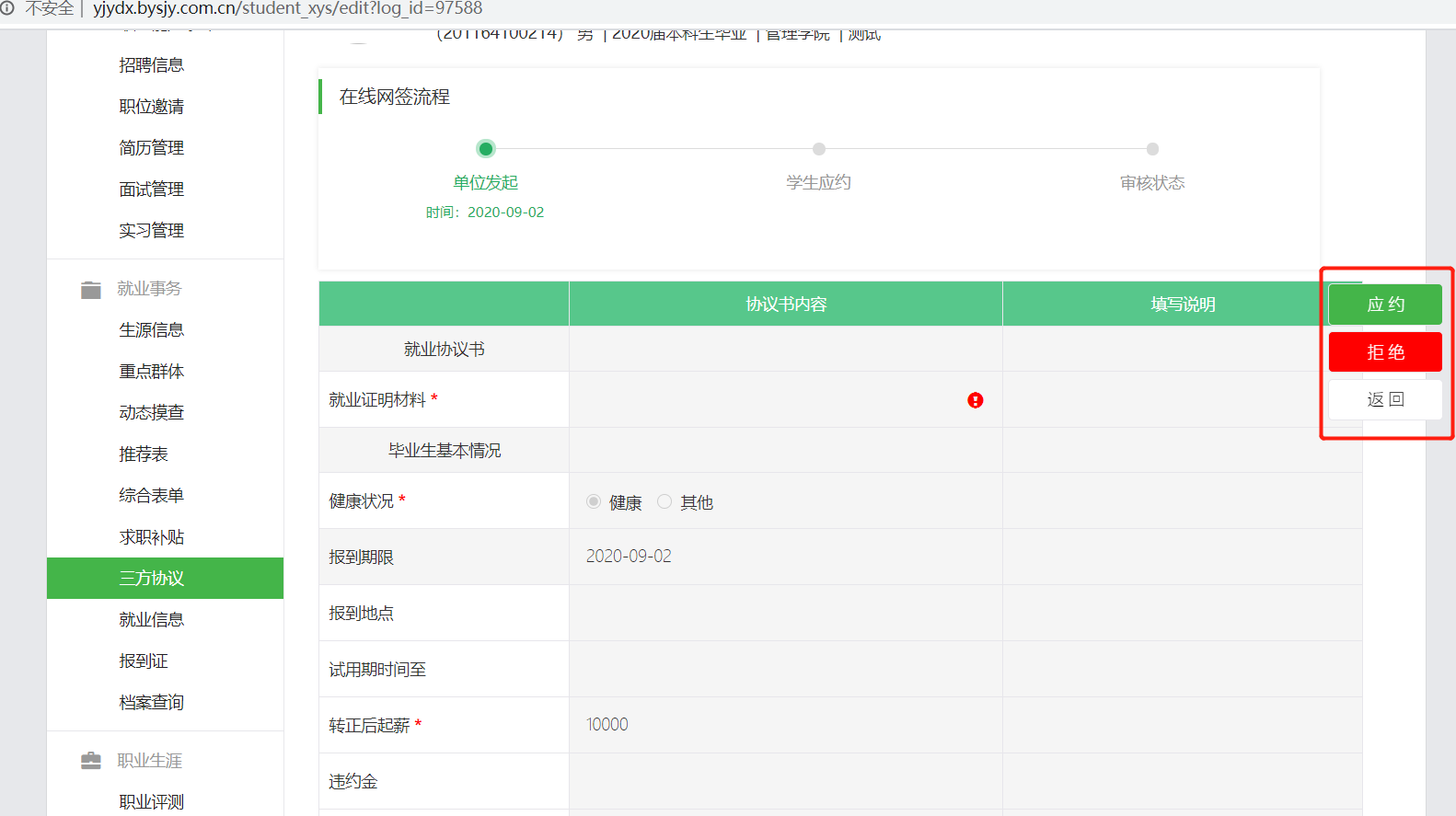 第四步:完善学生的签约信息,并保存;确认无误后,发起申请。